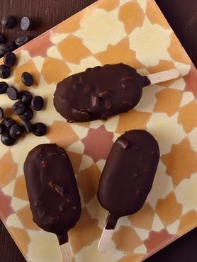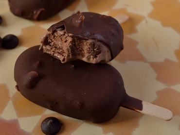 5. A csokoládét a kakaóvajjal összeolvasztjuk mikróban vagy vízgőz fölött. Az olvasztott csokoládét egy (magas, vékony) bögrébe öntjük, és hozzákeverjük a durvára aprított mogyorót is. Fogunk egy csokis jégkrémet, és teljesen megmártjuk az olvasztott csokoládéban. Érdemes a bögrét közben kicsit megdöntve tartani, úgy könnyebb bevonni a jégkrémet. A csokiburok esetleges hiányosságait kiskanállal javítjuk. A csokoládé gyakorlatilag azonnal ráfagy a jégkrémre. Ugyanígy bevonjuk a többi jégkrémet is.