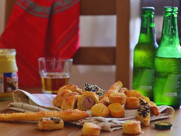 - A virslis kiflihez a kinyújtott tésztát négyzetekre vágjuk, mindegyik közepén elhelyezünk egy darabka virslit, feltekerjük, lezárjuk, jöhet a tojás és némi reszelt sajt a tetejére. Tálaláskor pedig ne feledkezzünk meg a hideg sörről és a mustárról sem!