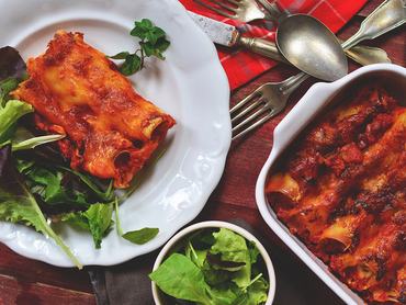 - Egy tűzálló tálba szedjük a paradicsomszósz kétharmad részét, elrendezzük rajta a tésztákat, befedjük a maradék szósszal.
