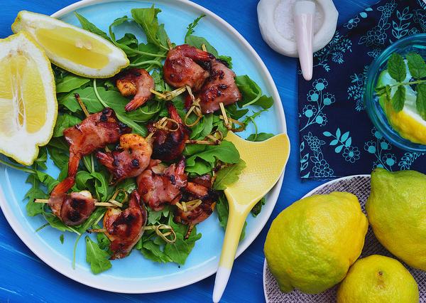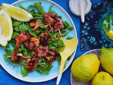 3. A sonkaszeleteket megfelezzük, rátekerjük a garnélákra, úgy, hogy a farokrész kilógjon. Egy fogvájóval vagy kisméretű nyárssal két helyen átszúrjuk.