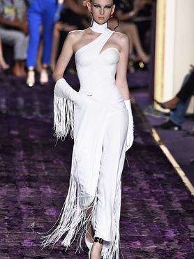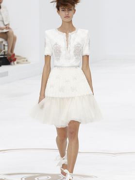 A moszkvai származású Ulyana Sergeenko extra fodrokat applikált rá egyébként elegáns esésű, V nyakkivágású couture ruháira, melyekhez húszas-harmincas éveket idéző frizurákat fésültek a mesterfodrászok a modelleknek. Míg Sergeenko fodrokban gondolkodott, addig a Valentino tervezői Lagerfeldhez hasonlóan fantáziát láttak a lapos talpú cipőkben. Ha a tógaszerű darabokért nem is rajongtunk, a fehér blézerrel kombinált menyasszonyi ruhát szerettük a kollekcióból.