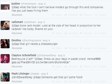 "Komolyan, GAP? Hol az istenben néznek ki így az emberek? Legközelebb talán olyan modellt kéne választanotok, aki hasonlít is az átlag nőre, nem pedig egy csontsovány kísértetet", illetve "Nézzétek a feje mekkora a testéhez képest. Szégyelljétek magatokat,GAP!" és még ezeknél durvább hozzászólásokban jelezték felháborodásukat a márka követői a Twitteren.