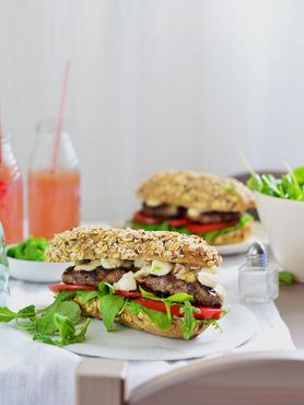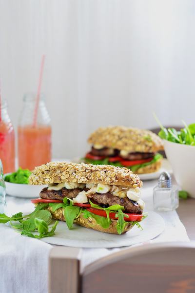 - A félbevágott bucik alsó felét megkenjük a zöldborsókrémmel, teszünk rá ruccolát, paradicsomszeleteket, végül a sajtos húsokat. Forrón tálaljuk.