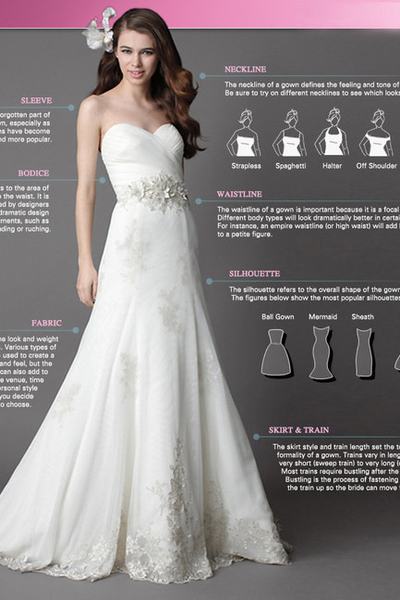 Nem csak az esküvőn, de a szalagavatóra való készülődéskor is érdemes tisztában lenni a menyasszonyi ruha alapvető részeivel, válasszon akár ujjatlan, spagettipántos vagy hosszú ujjú, szív alakú vagy egyenes dekoltázst. A sziluett a ruha egészének formájára vonatkozik, ami lehet hableány, A-vonalú, báli ruhára hajazó vagy egyenes, derékvonalnál pedig szeretik valamilyen díszítéssel, gyönggyel, kristállyal vagy csipkével is megspékelni a tervezők. Az uszály és az anyagválasztás szintén fontos tényezők, erről bővebben a mellékelt képen olvashat.