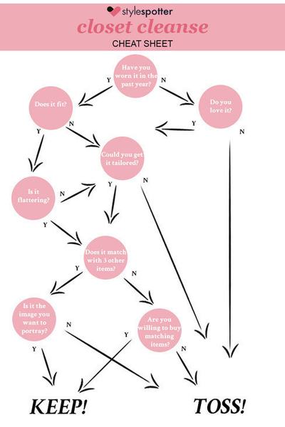 Teljesen felesleges olyan darabokat tartani a gardróbjában, amit nem hord. Oké, hogy a gardróbok első számú feladata a tárolás, ez viszont nem a megunt, kinőtt, kihízott vagy soha nem is hordott darabokra vonatkozik. Pedig a szanálás nem olyan nehéz dolog, főleg, ha az alábbi képet követve válogatja át a ruhatárát: hordta már a ruhát? Méretben jó? Át lehet szabatni? Ha nem, kuka!