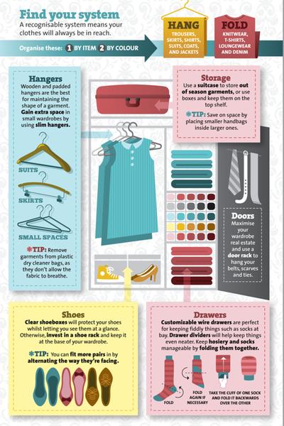 A rossz elrendezés miatt valószínűleg önnek is sok, egyébként teljesen használható ruhája lapul a szekrény mélyén, ezért egyáltalán nem is veszi számításba egy szett összeállításakor. Az alábbi infografika alapján praktikusan átrendezheti gardróbját a jobb kihasználhatóság érdekében, ráadásul a saját életét is megkönnyíti, ha nem találomra turkál, hanem szín és fazon alapján, célirányosan keresi az adott darabot. Nem nagy meló, könnyen átszoktathatja magát, egy unalmas szombat délután pedig le is tudhatja az egészet.