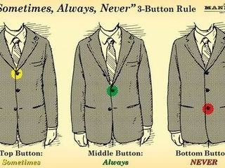 Alapinfó, amivel minden férfinak tisztában kell lennie: egysoros, kétgombos fazonnál a felsőt szokás begombolni és az alsót nem, egysoros háromgombosnál pedig – mint a képen – több verzió is működik, a lényeg, hogy a felsőt csak néha, a középsőt mindig, a harmadikat pedig soha ne gombolja be.