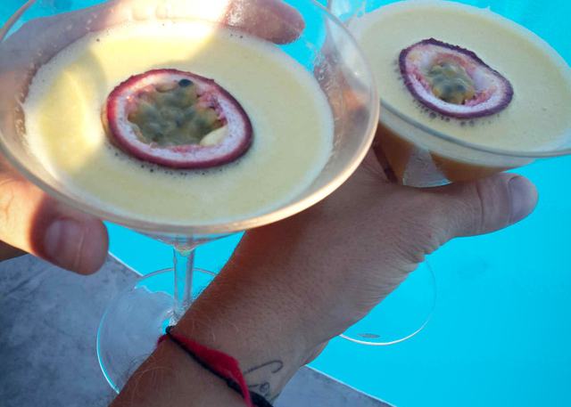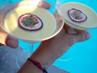 Amikor idén nyáron Mykonoson jártunk, félretettük kicsit a szokásos Chardonnay-mániánkat, és úgy döntöttünk, kísérletezünk kicsit a helyi koktélokkal. Az önfeláldozó kutatás meghozta gyümölcsét: megtaláltuk a világ legfinomabb italát, amelyet a Super Paradise Beach egyik medencés bárjában, a Jackie O-ban kínáltak. A Freddie Mercury-ra hajazó pultossrácnak csak annyit mondtunk: “Készíts valami nagyon erőset, de nem túl édeset”. Bár a koktéllapon nem is szerepelt, hamarosan elénk tolta ezt a maracujakoktélt, amit azóta időről időre újra-teremtünk, felidézve a szép emlékeket... már ha emlékeznénk valamire az éjszaka hátralévő részéről.