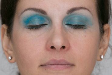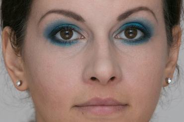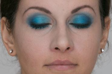 Maradunk ennél a kék sminknél, hogy megmutassuk azt is, egy szín - nem szín. Minden szemfestésnél használnunk kell három (de minimum két!) különböző árnyalatot, a jobboldali képen ez egy natúrszín (ez a kiemelőszín), egy világosabb (ez a középtónus) és egy sötétebb kék (ez az árnyékolószín) – így lehet kialakítani az ideális szemformát. Sajnos ezek a színek szemforma függvényében mindenkinek máshova kerülnek.
