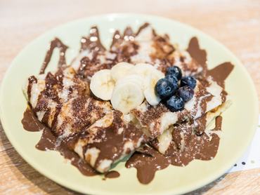6. Ha megsült az egyik oldala - ez kb 1-2 percet vesz igénybe, tegye bele az apróra vágott tölteléket. Autentikusan ez valamilyen egzotikus gyümölcs: ananász, banán, mangó, de mehet bele szinte bármi. A kerek lap négy oldalát hajtogassa össze, és fordítsa meg a csomagot, hogy a másik oldala is átsüljön. 1 perc és kész. Tálalja cukorból és sűritett tejből kevert szósszal, vagy egye csak magában.