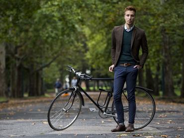 Szeptemberben a Csak Pasik eseményen zsűriztem, ahova természetesen én is biciklivel érkeztem. Szerencsém volt, mert a tweed zakóm jó kiindulópont volt az összeállítás megtervezésénél, ehhez választottam a világoskék inget és a sötétkék nadrágot. Indulásnál nem teljesen tudtam eldönteni, hogy fázni fogok-e vagy sem, de mivel elég borús volt az ég, egy pulóvert is felvettem. Ősszel sem szeretek feketébe bújni és a városkép is vidámabb egy fokkal, amikor az emberek nem monokróm árnyalatokat, hanem mély őszi színeket választanak.