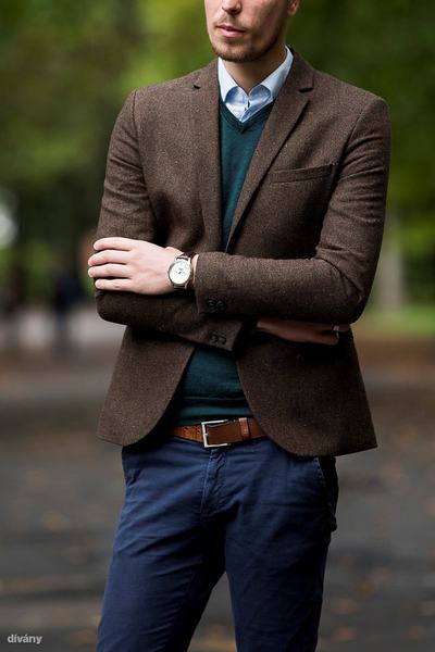 Szerzőnk egy biciklis eseményre vette fel barna zakóját, amit a kék árnyalataival egészített ki.