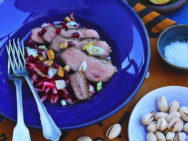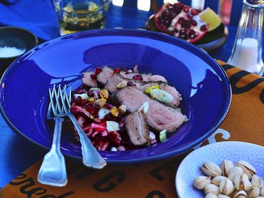 Ameddig sül a hús, bőven össze tudjuk állítani a céklából, almából, gránátalmából és újhagymából álló köretet.
