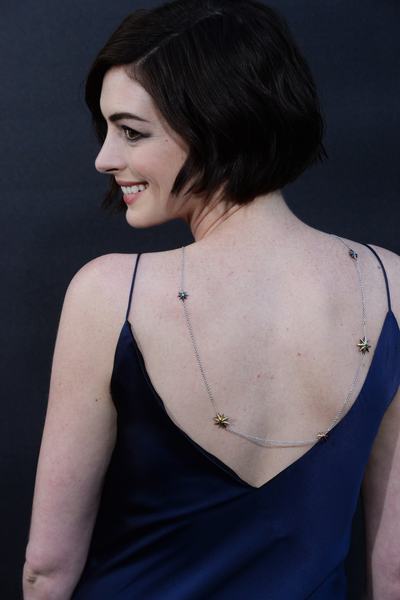 A celebnőknél újabban – még mindig, már megint – a hátrafordított nyaklánc a legmenőbb vörösszőnyeges kiegészítő. A héten már egyszer nagyon rosszul felöltözött Anne Hathaway például októberben csodásan festett hátláncával, egyszerű sötétkék Richard Nicoll ruhájában: mély dekoltázs helyett hátat villantani még mindig nagyon szexi trükk.