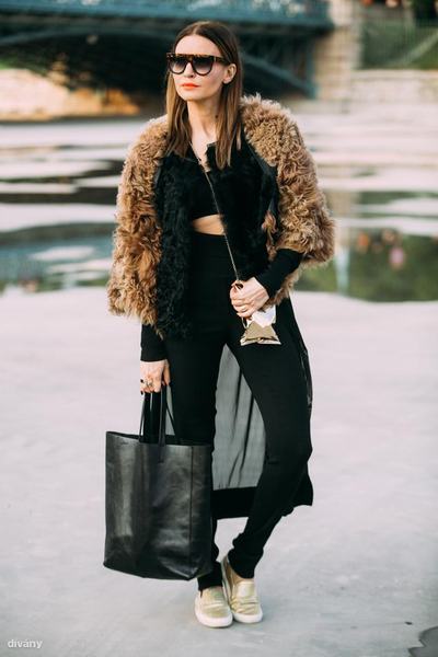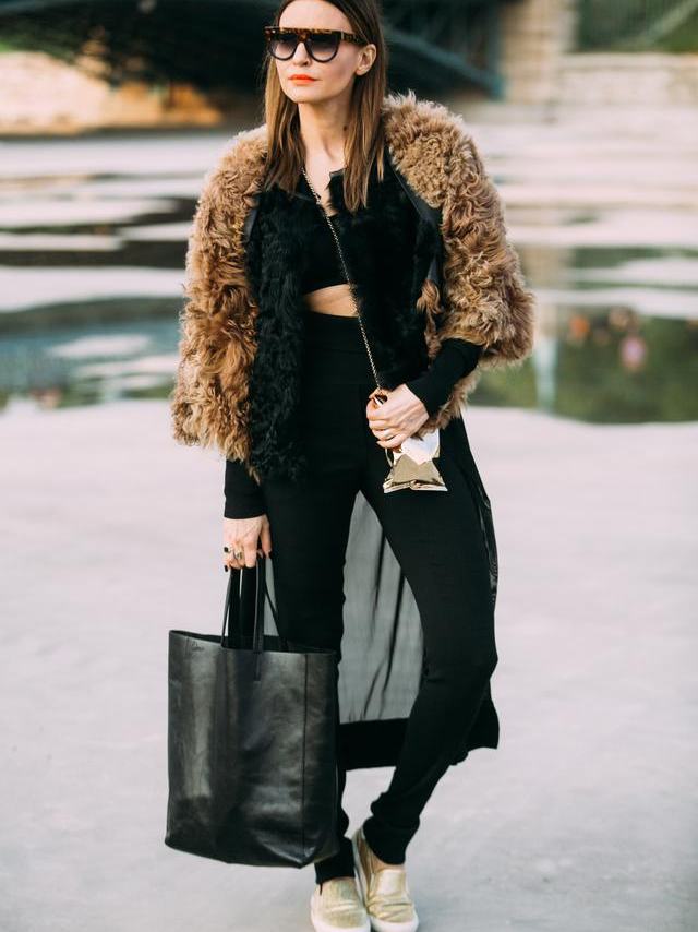 Joanna vastag, bundás dzsekije pont elég meleg ilyen időben, és mivel a többi ruhája fekete, nem zavaróan feltűnő a barnával keveredik a fekete szőr. Az anyagok textúrájával remekül játszik Joanna a szetten belül, visel áttetsző, légies anyagot, farmert és súlyos bundát is. A kiegészítők aranyszínűek és szerencsére nem vitte őket túlzásba a hölgy, bár a duplatáskás trend még mindig nem a szívünk csücske – azért ha ilyen szép Anya Hindmarch táskáról van szó, elég megbocsájtóak vagyunk.