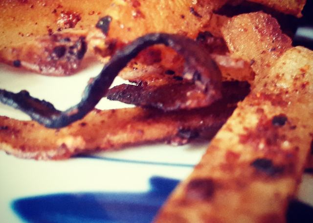 4. A forró sütőbe tolom, és 12 percre békén hagyom – de azért az utolsó pár percben rá-rápillantgatok, nehogy odakozmáljon. Akkor van kész, ha bacon-színe van, és itt-ott hajszálnyit oda is kap – vigyázat, ilyenkor másodpercek választják el attól, hogy koromfekete és felhasználhatatlan legyen az egész cucc.
