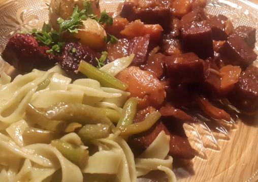 3. Pótlom az elpárolgott zsiradékot, és ha már ismét pezseg, mehet bele a hagyma, majd ha már üvegesedni kezd, a sárgarépa (vagy édesburgonya). Ezeket is fűszerezem, megpirítgatom, majd a vegán-pörkölthöz kanalazom.
