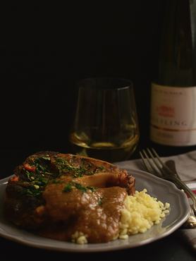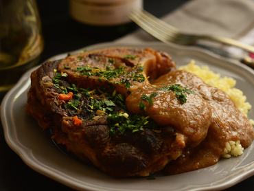 Így nem hagyományos ossobuco lett, hanem lassan sült marha, ami majdnem négy órán át csücsült a sütőben az ízes zöldségágyon. Végül olyan omlós lett a hús, hogy szinte elolvadt a szánkban, a velő pedig kipottyant a közepéből.