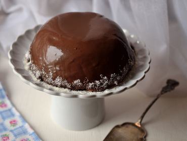 4. Másnap kiborítjuk, lehúzzuk róla a fóliát, és a fent leírtak szerint elkészítjük a csokoládébevonatot a csokiból, tejszínből és a mézből, és bevonjuk vele a bombát.