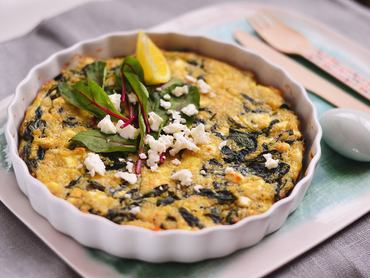- Összekeverjük a leszűrt quinoát, a spenótot, a morzsolt fetát és a tojást, megborsozzuk.