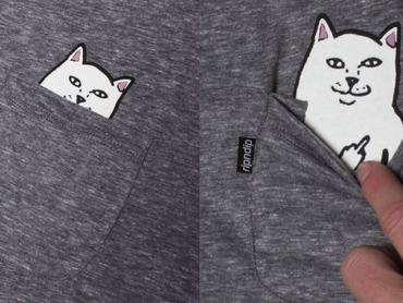 Szeretjük a kreatív, nem tizenkettő egy tucat cuccokat, egy amerikai márka felsője viszont még nekünk is meglepetést okozott. A Ripndip által tervezett póló zsebében egy cukin mosolyogó macska bújik meg, a zsebrészt lehajtva pedig kiderül, hogy egyáltalán nem ok nélkül mosolyog, az anyag alatt ugyanis sunyin bemutat nézőjének. A Lord Nermal művésznévre keresztelt macskának persze baromi nagy sikere van, és lássuk be, bőven akadnak olyan szituációk, mikor hasznát veszi az ember.