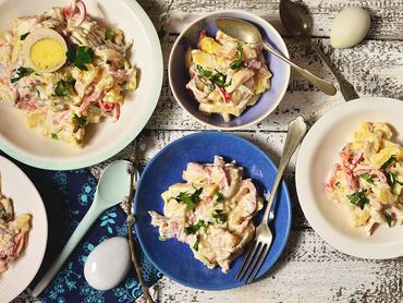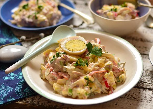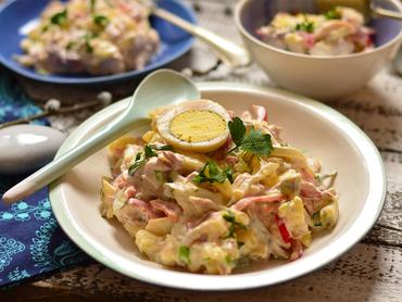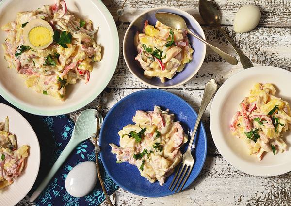 Ilyenkor nem túl sok hozzávalóból jó kis sonkasalátát készíthetünk. De ez a recept nem csak maradékhasznosításra alkalmas, akkor is praktikus, ha várjuk a locsolókat, vagy vendégség lesz, de kevés a sonka.