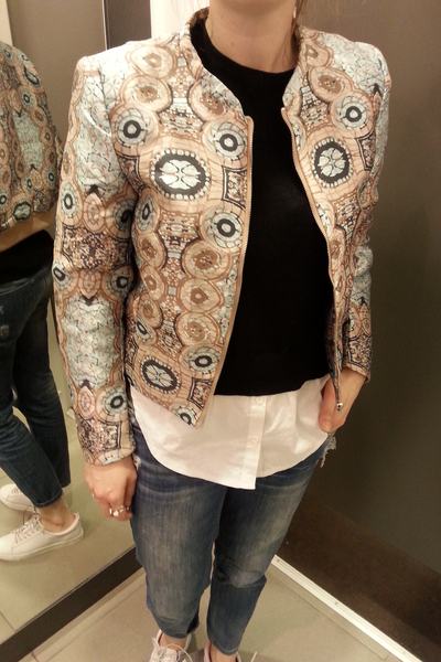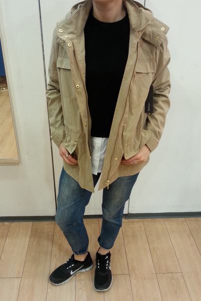 A H&M-ben csinos bomberdzsekiket találtunk (mint ez itt alább a képen), amikkel bármilyen szettet fel lehet dobni, mégis elegánsak és kényelmesek. Ballonkabát helyett itt egy militaryzöld lebernyeget próbáltunk, ami elég rossz választásnak bizonyult, túl vékony az anyaga ahhoz, hogy ne legyen béna az esése. Farmerdzsekit 10 ezer forint alatti áron kap, de ennyiért ne számítson semmi különösre. Még egy narancsszín oversized kabát ragadta meg figyelmünket, ami annak ellenére, hogy 34-es méret, simán csak óriásinak néz ki, szóval nem azért hagytuk a polcon, mert nem volt rá épp 30 ezer forintunk, hanem azért mert a jó anyag- és színválasztás ellenére nem volt egy tökéletes darab.