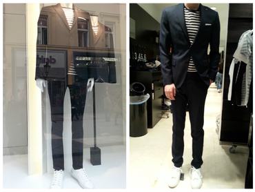 A Zarában álmodni sem mertünk arról, hogy ez a férfi szett rajtunk is ilyen jól mutat, de végül pozitívan csalódtunk. Sajnos ugyanaz az öltönyt a boltban nem találták meg az eladók, mint amit a kirakatban is hirdetnek, de egy hasonlóra sikerült lecsaptunk. Egyébként az öltöny-sportcipő trenddel érdemes vigyázni, mert a nagyon formális zakó-nadrág párossal nem mutat jól, viszont egy lenből készült vagy sportzakó esetében nincs mitől félnie.