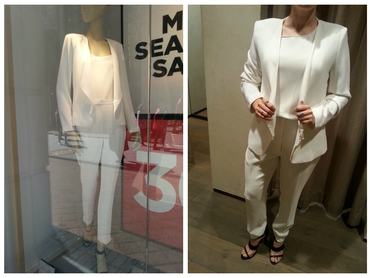Mivel tavaly nyáron a Mango szépen csendben megszüntette itthon az egyetlen férfirészlegét, így itt csak női szettet tudtunk fotózni. Bár a tetőtől-talpig fehér szett-től viszolygok, a babán nagyon elegáns és légies volt az összeállítás. A valóságban a nadrág szuper volt és a magassarkúval remekül mutatott, de a blézer olcsó hatású volt, a felső pedig kellemetlen műszálas anyagú, ami csak lógott rajtam, mint tehénen a gatya. Igazából a nadrág is simán lehet, hogy átlátszott volna, ha utcára megyek benne, szóval ezt a szettet így biztos nem vállalnám be annak ellenére sem, hogy a fotón egész emberi a látvány.