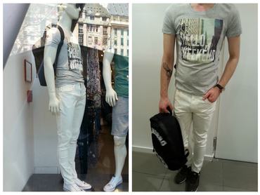 A H&M volt az a hely, ahol a próbababán még egész normálisan néztek ki az összeállítások, felvéve viszont elég fura lett a végeredmény. A férfi szett nekem túl világos, nem mernék egy ilyen nadrágban rohangálni a városban nyáron, ráadásul a fekete táskát sem értem igazából - nem annyira passzol az összképhez.