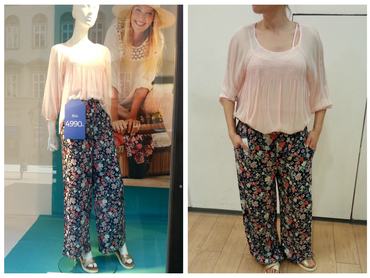 Már a kirakatban kiszúrtam, hogy itt bajok lesznek, az én 160 centis magasságommal ugyanis a bő nadrágok egyszerűen nem passzolnak. Főleg nem bő felsővel. De szeritnem ez a kombó még a magas vékony nőkön is csak ront. Az üzletben egyszerű volt összeszedni a szettet, mert rögtön a bejárat mellé voltak kipakolva a ruhák, de sajnos a végeredmény pont olyan szörnyű, mint gondoltam. Az már a legkisebb baj, hogy a felső anyaga csapnivaló, nyári melegben hordhatatlan.