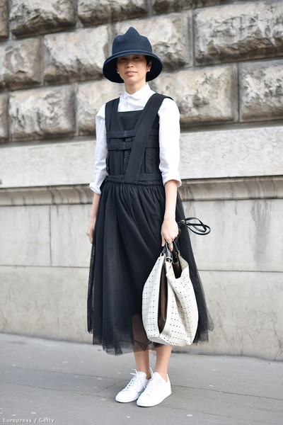 Egy lenge tavaszi/nyári ruhát a hidegebb, őszi időszakban is felvehet – akár harisnya nélkül is –, a trükk csak annyi, hogy alá kell venni egy hosszított ujjú felsőt. Ahogy az alábbi street style fotón is látszik, az egyébként egészen alkalmi ruhát egy hófehér, hosszú ujjú inggel, kalappal, és a most igazán trendi tornacipő-trenddel kombinálta viselője.