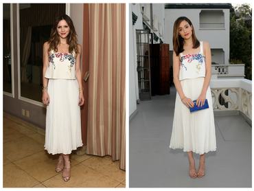 Katharine McPhee-ben és Emmy Rossumban amellett, hogy mindketten színésznőként keresik a kenyerüket, akad még egy közös: mindkettejüknek megtetszett Elle Sasson ruhája. A felsőrészen színes virágszirmokkal díszített, alul pliszírozott ruhához McPhee ezüst színű magassarkú szandált húzott fel, amikor elment a Guiseppe Zanotti Beverly Hills-i üzletének megnyitását ünneplő buliba. Lábkörmeit rózsaszínre festette, a manikűrje pedig valamilyen érthetetlen módon feketére sikerült. Úgy gondolta, a szettet kiegészítőkkel dobja fel: egyaránt aggatott magára ezüst és arany színű darabokat is. Bár a ruha nyakrésze így is eléggé hangsúlyos, a karkötők helyett mi sokkal inkább el tudnánk képzelni egy decens nyakláncot. De hát mi nem vagyunk Katharine McPhee.