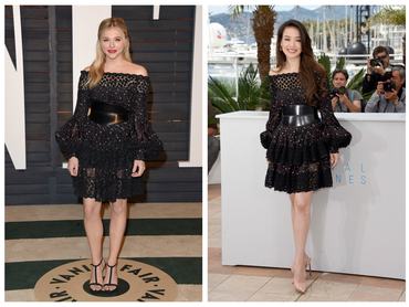 Chloe Moretz az idei Vanity Fair Oscar partira érkezett ebben az Alexander McQueen-csodában, amihez fekete magassarkút vett fel. A halványszürke körömlakk tökéletes választás – pont úgy, ahogy az ezüst nyaklánc és a vörös rúzs is. Shu Qi pár hete Cannes-ban sütött el egy hasonló szettet – igaz, ő a nude magassarkút húzott fel hozzá (egyébként teljesen más így az összkép, nem?!). Ő nyakláncot nem, viszont egy pár piros-rózsaszín, legyező formára hajazó fülbevalót vett fel hozzá. Gondolná egyébként, hogy a színésznő 39 éves?