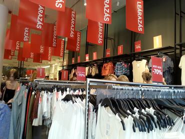 A Zarában gyakorlatilag ugyanaz a helyzet, mint egy vagy két héttel ezelőtt: az árak stagnálnak, hiába reménykedtünk, hogy olcsóbban le tudunk csapni néhány régóta kiszemelt darabra – ha egyáltalán van még belőle. A Zarában ugyanis elég változóak a kedvezmények: rövidnadrágot és inget például átlag 5-6 ezer forint között találni – azért ez még közel sem az az ár, amiért a pénztárcánkba nyúlnánk így a nyár közepén, akkor sem, ha egy ing teljes áron tízezer forintba került – nyári ruhákat pedig 5995-14.995 forintos intervallumon belül kap. Blézert már tízezer forint körül is kifoghat – máshol ez a teljes árat jelenti –, de oversized kabátot is kapni így július közepén, harmincezer helyett féláron, 14.995 forintért. Nem csoda, hogy ugyanazzal a kabáttal két emeleten is találkoztunk, ha pedig már most nem tudnak szabadulni tőle, augusztusra csak még olcsóbb lesz. Leárazott táskából is cipőből is akad van választék: borítéktáskát 2995-3995 forint között talál, a cipőknél viszont már eléggé érződik a mérethiány – 38 és 39-es lábúak hátrányban!