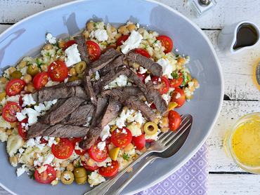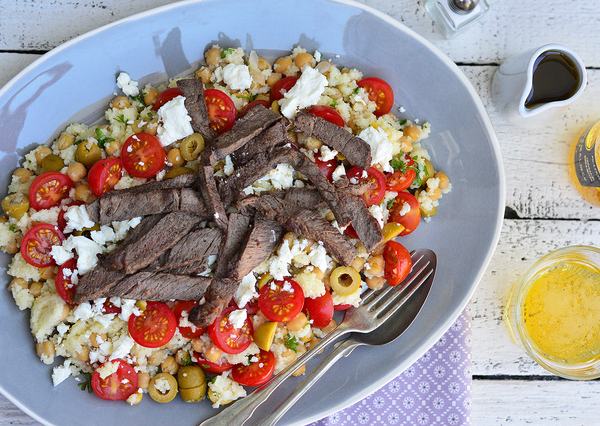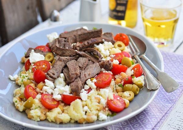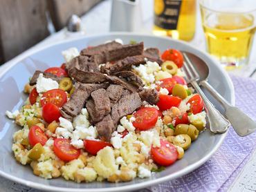 Elég gyakran marad ki egy-egy szelet finom grillhús hétvégén, amit már sehogy nem tudunk legyűrni. Pár perc alatt készíthet belőle egy finom és tartalmas salátát kuszkusszal, csicseriborsóval, paradicsommal, fetával és olajbogyóval.