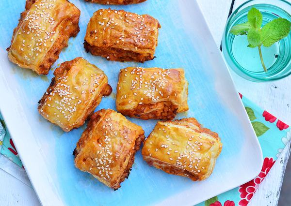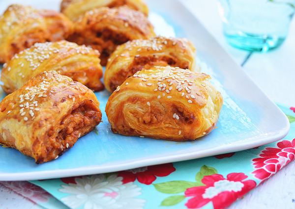 - A tésztát kisodorjuk, és eloszlatjuk rajta a húst. Megszórjuk reszelt sajttal, és feltekerjük. 2-3 cm-es vastagságú szeletekre vágjuk, sütőpapírral bélelt tepsire tesszük. Megkenjük elhabart tojással mindegyik tekercs tetejét, és megszórjuk szezámmaggal.