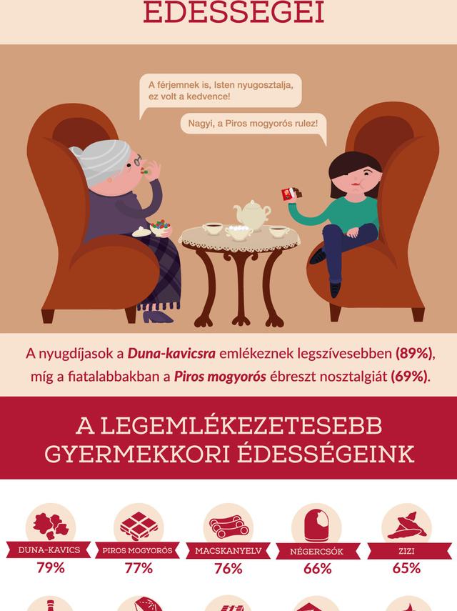 A reprezentatív minta alapján az édességek esetében a megkérdezettek 79 százaléka említette a Dunakavicsot, de a Piros Mogyoróst is 77 százalék emelte ki, míg a harmadik a macskanyelv lett, amelyet az emberek kicsit több, mint háromnegyede említett, főleg azért mert ezeket még ma is be lehet szerezni a boltokban. A Négercsók és a Zizi a középmezőnyben végzett, de sokan a citromos joghurt habra vagy a pezsgőporra (Limó!) is szívesen emlékeznek.