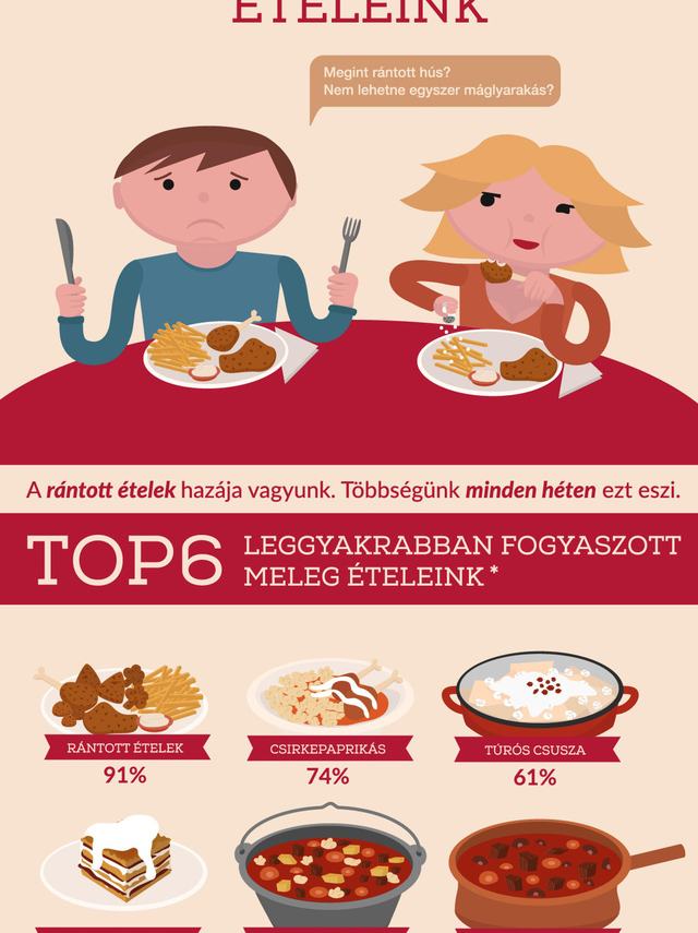 Felnőttként pedig a megkérdezettek többsége a magyar konyhát preferálja, abból is a rántott ételek az abszolút befutók, ezekből majdnem mindenki eszik havonta egyszer, de sokan szeretik a csirkepaprikást, a túrós csuszát vagy a rakott krumplit is.
