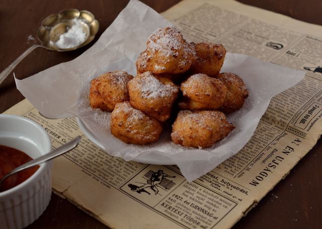 3. A masszából vizes teáskanál segítségével gombócokat szaggatunk forró étolajba. Bőven elég egy púpos teáskanálnyi mennyiség, mert sülés közben szépen meg fognak dagadni a gombócok a tésztában lévő sütőportól. A felfúvódott gombócok maguktól is meg tudnak fordulni a forró olajban, de figyeljünk arra, hogy minden oldaluk egyenletesen megsüljön. Ne hagyjuk viszont, hogy az olaj túl forróra hevüljön, mert akkor hirtelen sülnek meg kívül a gombócok, a belsejük viszont nyers marad.