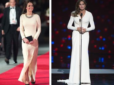 Ezek után kicsit kutakodtunk a képügynökségeknél, és találtunk még néhány hasonló darabot. Például eddig azt hittük, Angelina Jolie-ra hasonlított Jenner a nyári ESPYS gálán, ahol beszédet mondott, de nem, a hosszúujjú fehér ruhában sokkal inkább emlékeztetett Katalinra, mint a lábát villogtató színésznőre.