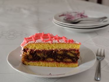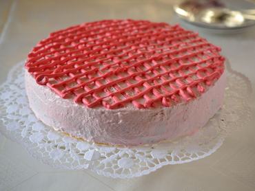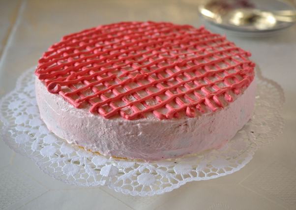 11. A bevonathoz a tojásfehérjéket a porcukorral vízgőz fölött kemény, fényes habbá verjük. Végül egy kevés piros ételfestékkel rózsaszínre színezzük. Ezzel vonjuk be a torta tetejét és az oldalát. A maradék tojáshabot egy kevés plusz festékkel picit sötétebbre színezzük, habzsákba vagy sima nejlonzacskóba (amelynek levágjuk a csücskét) töltjük, és becsíkozzuk vele a torta tetejét. Pár órán keresztül hagyjuk száradni a tojáshabot.