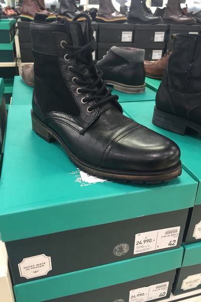 Itt nemcsak első, de sokadik ránézésre is minőségibb darabok fogadtak: egyrészt több a bőrből készült bakancs, másrészt nagyobb arányban béleltek. Előbbiek egyébként huszonezer forinttól indulnak, de ha műbőrre pályázik, akkor már feleannyiért is kap akciósan. Apropó árak: eléggé belőhetetlenek, ugyanis láttam nagyon jó külsejű bakancsot 15-ért és elég csúnyácskát kétszer annyiért. Inkább az elegáns vonal képviselteti magát, aki sportosra vágyik, szerintem jobban jár máshol.