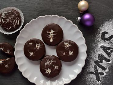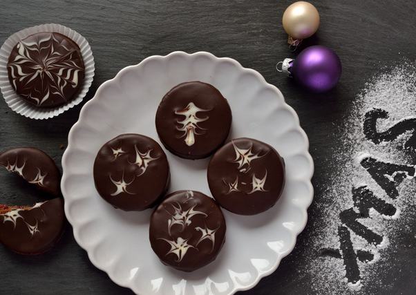 - Csillagmintához egy kiskanál segítségével három-négy fehércsoki-pettyet cseppentünk az étcsokis bevonatra, majd fogpiszkáló segítségével belehúzunk a pöttyökbe kifelé haladva – így készülnek ágak a csillagoknak.