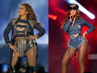 Beyoncé New Jersey-ben mutogatta lábait fellépés közben: az ő nadrágja se sokat takart a fenekéből és a combjából. A strasszokból és a láncokból is visszavett Lopezhez képest, de azért egy szárnyas oroszlánfejjel "díszített" övet ő is felkapott magára. A motívum feltűnt egyébként a háborús időket idéző sapkáján és a cipzárakon is.