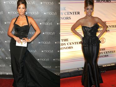 Beyoncé itt elég rendesen elaludt: a két kép között három év telt el. Lopez 2005-ben a Macy's eseményére vett fel egy fekete estélyit, amelynek dekoltázsrész szív alakú volt. A deréktájékon díszített ruhának volt egy méretes uszálya is - a szettet az énekesnő visszafogott (de annál drágább) ékszerekkel, fehér kistáskával és méhkasra emlékeztető turbánhajjal egészítette ki.