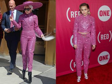 Első párosunk rögtön két nagyágyúból áll: ha csak a képet látjuk erről a Christian Cowan-Sanluis kosztümről és ki kellett volna találnunk, ki viselte őket, mi is Gagára és Cyrus-ra tippeltünk volna. Előbbi 2014 márciusának végén New Yorkban viselte, a méretes platformmal rendelkező magassarkú lakkcipőn kívül még egy glitteres kalapot is magára dobott. Valószínűleg táskát cipelni a kézben "annyira 2013!" volt az énekesnőszámára, ő inkább az ősz haját cipelte.