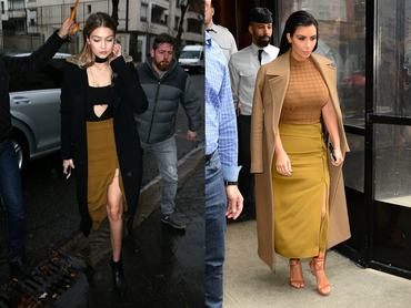 Bár utolsó párosunk nem pink, ikertornyok lévén muszáj megmutatnunk őket. Történt ugyanis, hogy mindketten egy olívazöld A.L.C: márkájú, egyébként 375 dolláros, azaz 100 ezer forintos szoknyát szemeltek ki maguknak. Hadid pár hete a párizsi divathéten viselte, hozzá pedig egy 800 ezres kabátot, 30 ezres bodyt és 76 ezres bokacsizmát vett fel. Dekoltázsát decens ékszerekkel hangsúlyozta.