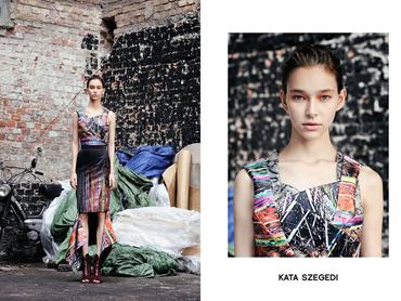 "A darabok megalkotásának kiindulópontja Gazdag Konrád fotója, mely printként eredeti és Kata által roncsolt formában is megjelenik a ruhákon. A kollekciót José Parlá munkássága is befolyásolta, hisz Katához hasonlóan a Brooklynban élő művész is az utca lüktetéséből, a metropoliszok hangulatából merít“ – olvasható a tervező sajtóanyagában. A glitch art, azaz a hibaművészet, a képmanipuláció, roncsolás és újjáteremtés ihlette kollekció színvilágát javarészt a terepzöld, a babakék, a narancs, a fekete, valamint az ezüst jellemzik, mi pedig szívesen látnánk a ruhatárunkban a földig érő bársony ruhát, a flitteres nadrágot, illetve az ezüst bomberdzsekit is a nyári szezonban.