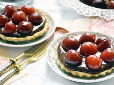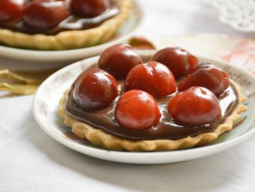 6. A tésztakosarakat hűlni hagyjuk, beletöltjük a csokikrémet, kirakjuk a lecsöpögtetett rumos cseresznyével.